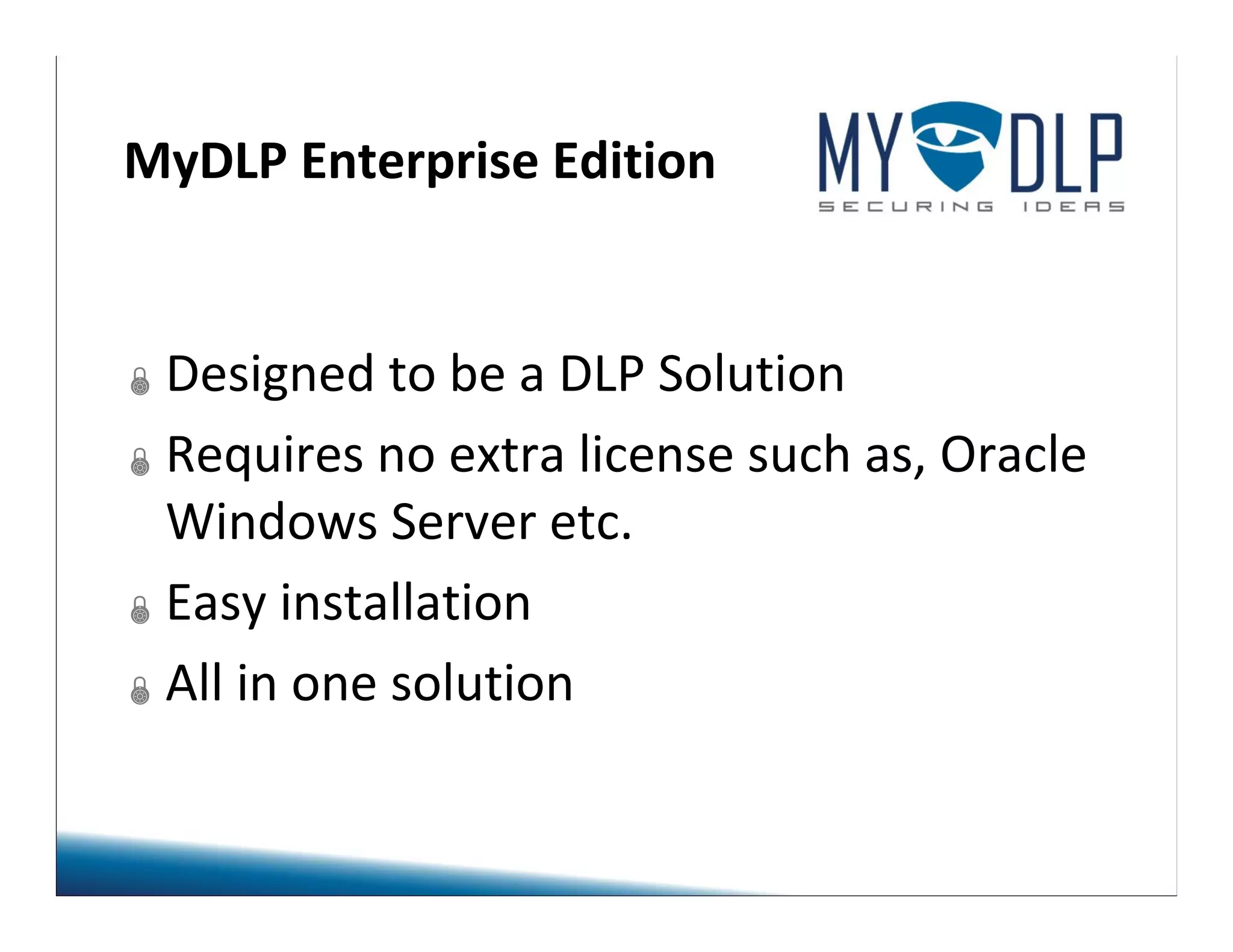 This document describes MyDLP Enterprise Edition, a data loss prevention solution that requires no additional licenses. It can be installed on various Windows server and client operating systems. The solution includes components for network protection, information discovery, endpoint protection, and printer protection that are managed through a centralized console.