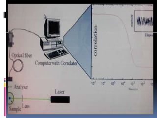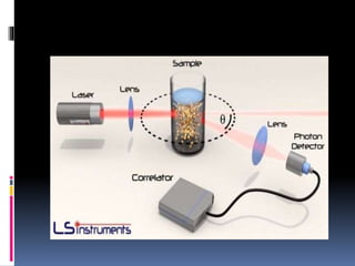 Dynamic light scattering (DLS) is a technique used to determine the size of particles in solution, such as proteins, polymers, micelles, and nanoparticles. A laser is shone through the solution, and the intensity of the scattered light is measured over time. By analyzing fluctuations in this scattered light intensity caused by Brownian motion of the particles, the diffusion coefficient and size can be calculated. DLS is widely used in fields like biotechnology and pharmaceuticals to quickly characterize sample polydispersity and monitor particle aggregation as it is non-invasive, fast, and easy to use.