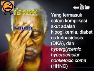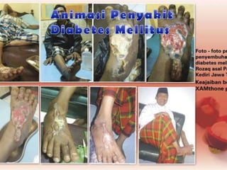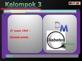 Diabetes melitus adalah kelainan metabolisme kronis yang ditandai dengan hiperglikemia akibat defisiensi insulin, dengan prevalensi tinggi di kalangan lansia. Terdapat dua tipe diabetes: tipe I yang lebih umum pada usia muda dan tipe II yang biasanya terjadi pada usia lebih dari 45 tahun, termasuk dengan risiko komplikasi seperti retinopati dan neuropati. Penanganan diabetes melibatkan diet yang ketat, olahraga, dan pemantauan glukosa darah, dengan perhatian khusus pada kemungkinan pewarisan dan gaya hidup.