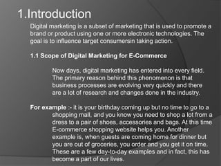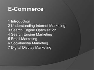 Digital marketing uses various electronic technologies to promote brands and products online. This document discusses key digital marketing tactics for e-commerce including search engine optimization (SEO), search engine marketing (SEM), email marketing, social media marketing, and digital display advertising. SEO involves optimizing websites to rank higher in organic search results while SEM includes both unpaid SEO efforts as well as paid search advertising. Email, social media, and display ads are also important for connecting with customers and driving online sales.
