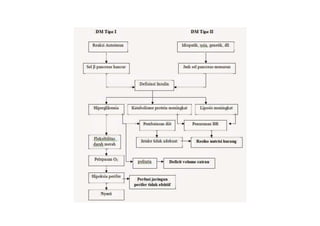 Diabetes mellitus adalah penyakit hiperglikemia yang diakibatkan oleh disfungsi insulin, dengan dua tipe utama: Tipe I yang bergantung pada insulin dan Tipe II yang tidak bergantung pada insulin, yang paling umum. Penyakit ini dapat menyebabkan berbagai komplikasi serius dan memerlukan pengelolaan yang ketat melalui diet, olahraga, dan pengobatan. Gejala termasuk poliuria, polidipsia, dan kondisi akut seperti ketoasidosis dan sindrom hiperglikemik hiperosmolar.