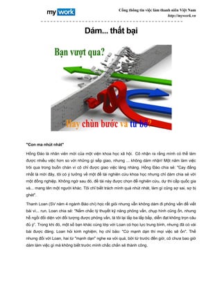 Bài viết phản ánh nỗi sợ hãi và sự nhút nhát của những sinh viên trẻ khi bắt đầu sự nghiệp trong môi trường làm việc. Nhiều bạn trẻ bày tỏ cảm giác tự ti và lo lắng khi đối diện với thử thách, nhưng cũng có những câu chuyện đầy cảm hứng về việc vượt qua nỗi sợ và thành công. Cuối cùng, thông điệp khuyến khích giới trẻ cần phải dám làm và chấp nhận thất bại để trưởng thành và thành công hơn.