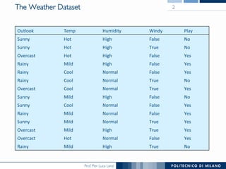 The document discusses decision trees and their construction. It begins by presenting the weather dataset with various attribute values and classifications. It then shows the decision tree constructed for this dataset, with internal nodes testing attributes and leaf nodes assigning a 'play' classification. The document goes on to explain the top-down induction of decision trees, considering attributes, stopping criteria, and how the best splitting attribute is determined using measures like information gain and information gain ratio to select the attribute that provides the most information about the target classification. It also addresses handling of numerical attributes through discretization.