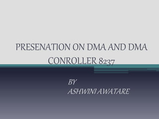 This presentation summarizes Direct Memory Access (DMA) and the Intel 8237 DMA controller. It defines DMA as transferring data between memory and I/O devices without CPU intervention, allowing high-speed transfers. The 8237 DMA controller handles DMA operations by controlling the address bus, data bus, and transfer modes. It has registers for addresses, counts, commands, modes and status. Transfer modes include single, block, demand, cascade and memory-to-memory.