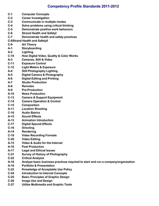 The document provides information about a student named Danika Olson enrolled in the Digital Media Arts program with an emphasis on Animation Technology. It lists her contact information, dates of registration and completion, current grade level, expected graduation year, and total hours spent in the program. It also includes two standards documents outlining various competencies and skills related to digital media arts, including animation, videography, photography, design, and production. The standards cover topics such as computer concepts, health and safety practices, lighting, camera operation, composition, editing, and legal/ethical issues.