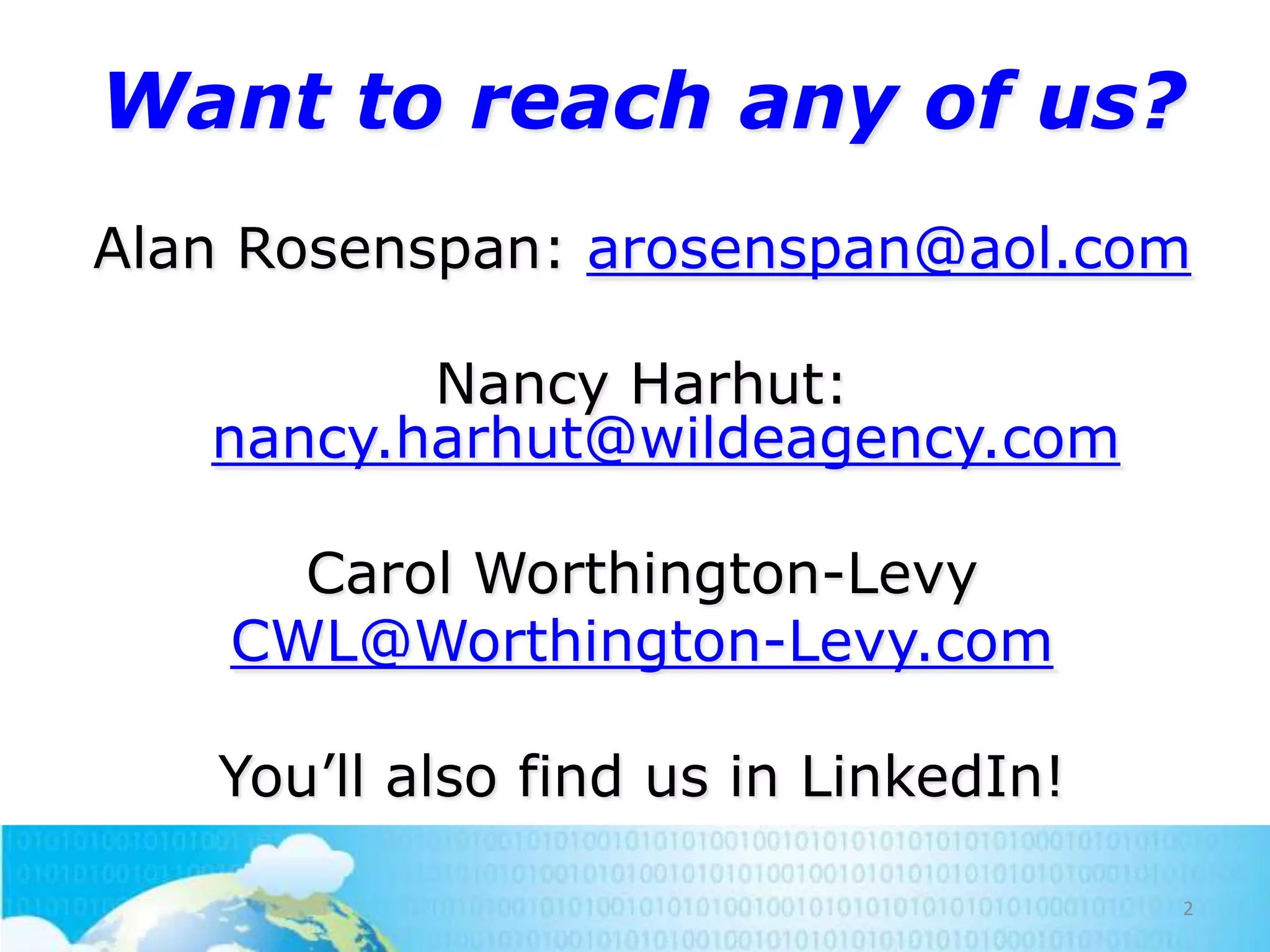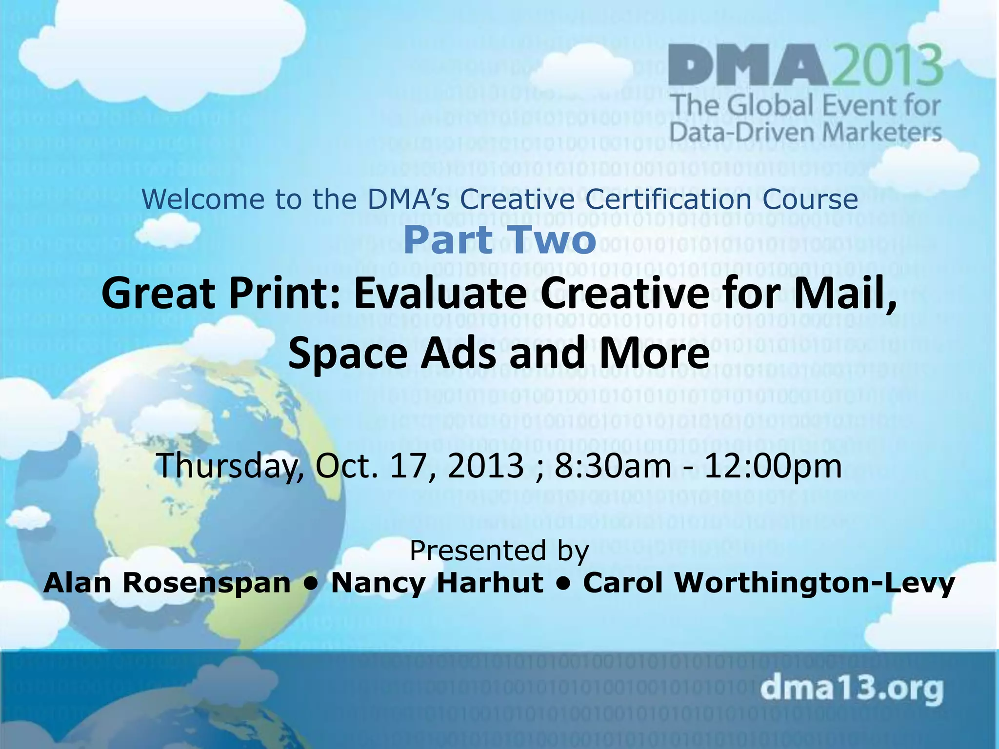 This document summarizes a presentation on evaluating creative for print advertising, mailers, and other mediums. It provides examples of challenges faced and solutions implemented for real clients. The presentation covers evaluating elements of successful copywriting, drivers of effective direct mail and print ads, and how to create attention-grabbing concepts that sell. Speakers share case studies on campaigns for a luxury real estate development and a life insurance product for dentists. They discuss strategies used to make the creative more effective and results achieved.