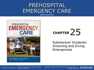 This document discusses water-related emergencies like drowning. It provides information on prevention, pathophysiology, assessment and management. Drowning can result from hypoxia caused by water inhalation or laryngospasm. Factors influencing survival include submersion time, age, and response time for resuscitation. Assessment of drowning patients involves considering possible spinal injury, establishing an airway, providing ventilation and oxygenation, and treating for shock. Proper safety precautions must be taken when responding to scenes near water.