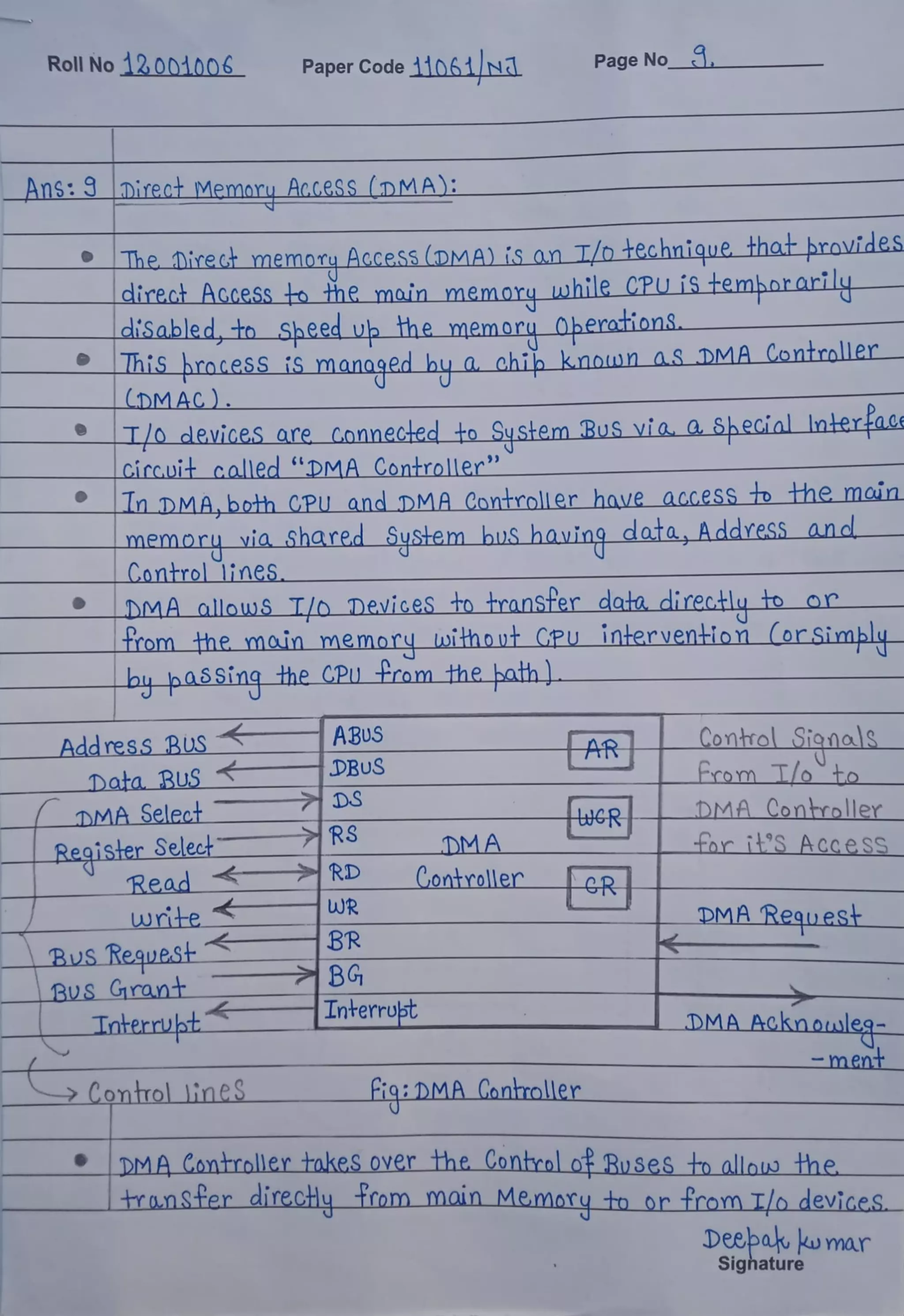 The document discusses Direct Memory Access (DMA) which allows input/output (I/O) devices to access main memory directly without intervention from the Central Processing Unit (CPU). It describes how the DMA controller takes control of the address bus, data bus, read and write lines to facilitate direct transfer between I/O devices and memory while the CPU is temporarily disabled. It also explains the different signals and lines used by the DMA controller to communicate with devices and memory as well as the two common modes of DMA transfer: burst and cycle stealing.