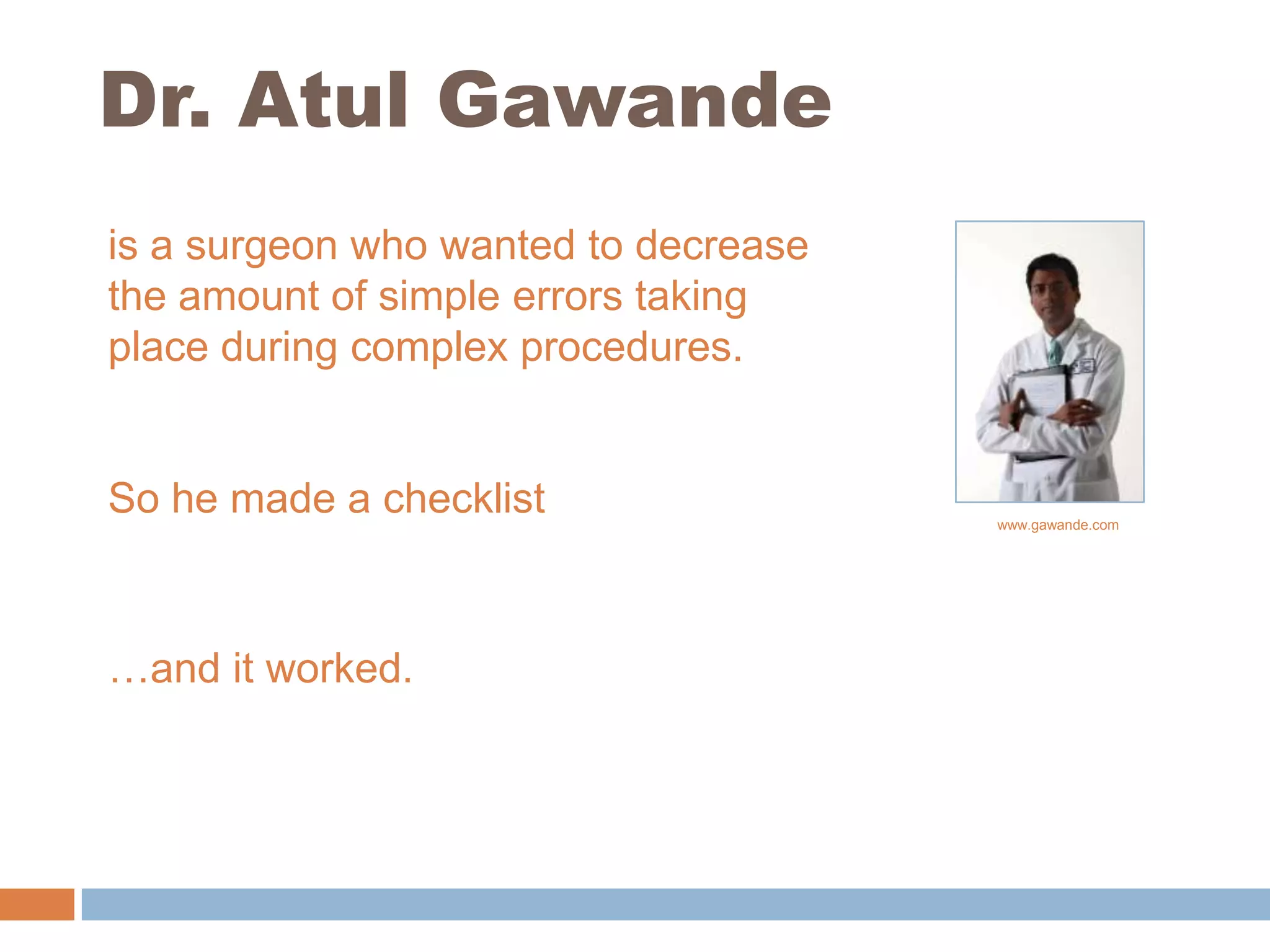 Dr. Atul Gawande developed a surgical checklist to reduce errors during complex procedures, resulting in a 40% reduction in inpatient deaths and one-third fewer surgical complications. His experiences are documented in 'The Checklist Manifesto,' which influenced DMC, Inc. to create checklists for their common tasks to ensure essential steps are not overlooked. The DMC checklists include tasks such as planning calls, customer qualifications, proposal generation, and project trips.