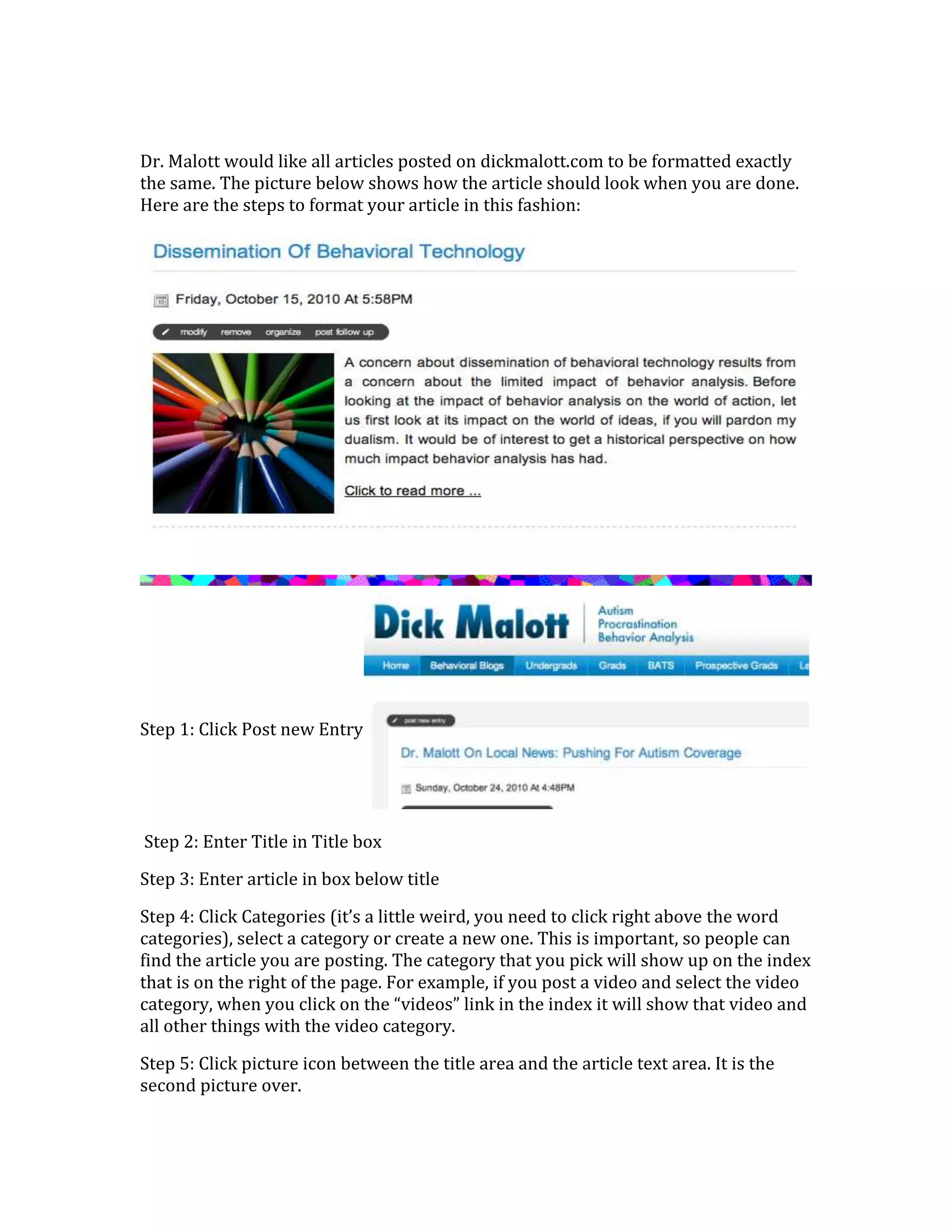 The document provides 11 steps for formatting an article to be posted on a website so that it has a consistent look and includes key information like the title, content, category, image, and summary. The steps include selecting a category, uploading an image, setting the image size and alignment, and copying content to the summary field for a preview of the article.