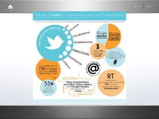 This document provides guidance on using social media for professional purposes in academia. It discusses that professionalization involves communication and social skills. Twitter is recommended as a starting platform due to its large and supportive community and flexibility. The document outlines best practices for using Twitter, such as reporting on work, asking questions, and sharing content. It also discusses using social media to engage in academic conversations, gain different perspectives, and build professional networks.
