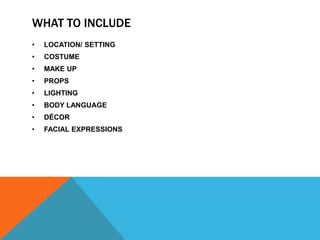 This document outlines various elements that can be included in visual storytelling to convey meaning and information, such as setting, costumes, makeup, props, lighting, body language, decor, and facial expressions. It discusses how each element can be used to represent historical periods or genres, indicate changes in a character's narrative, express gender or age, set mood and atmosphere, and reinforce the overall story being told. The document provides examples of how these elements are commonly used in different types of visual media like film, television, and theater.