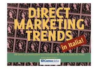 Il documento esplora le tendenze del marketing diretto, evidenziando l'importanza dei dati e dei media scelti. Nel 2011, il direct mailing e Internet erano i soli media pubblicitari in crescita in Italia. Si sottolinea la necessità di una strategia multicanale e dell'analisi continua del ROI per ottimizzare le campagne di marketing diretto.