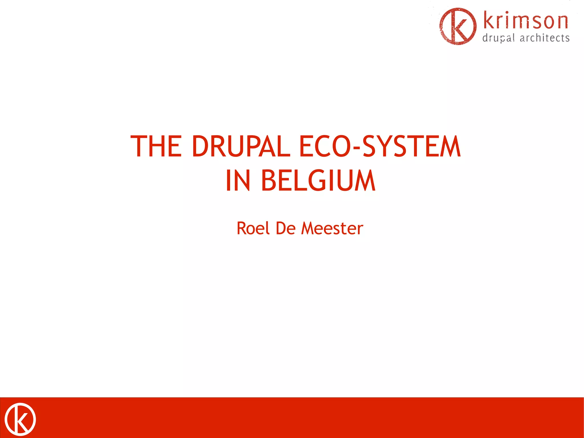 The document discusses the Drupal ecosystem in Belgium, highlighting its open-source nature and the growing convergence of open and closed source systems. It emphasizes the need for more trained Drupal developers, with concerns about the current supply being insufficient to meet demand. An initiative from Acquia aims to enhance training and development opportunities within the community.