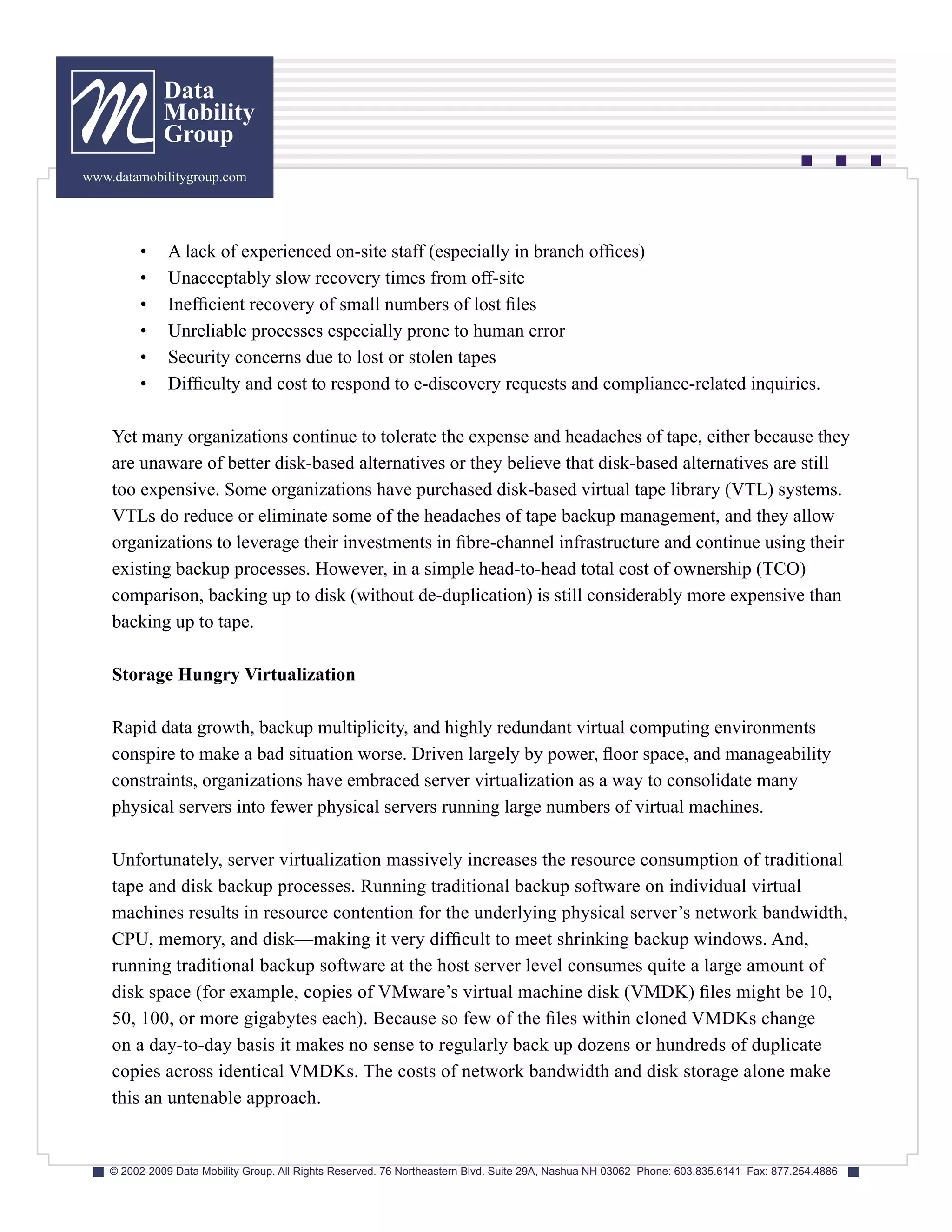 This document discusses data protection challenges with traditional tape backups and the advantages of disk-based backups using data de-duplication technology. It examines EMC Avamar's source/global data de-duplication approach, which optimizes backup performance by reducing redundant data before transmission. Key benefits highlighted include faster daily full backups, lower bandwidth usage, shorter backup windows, and reduced storage requirements.