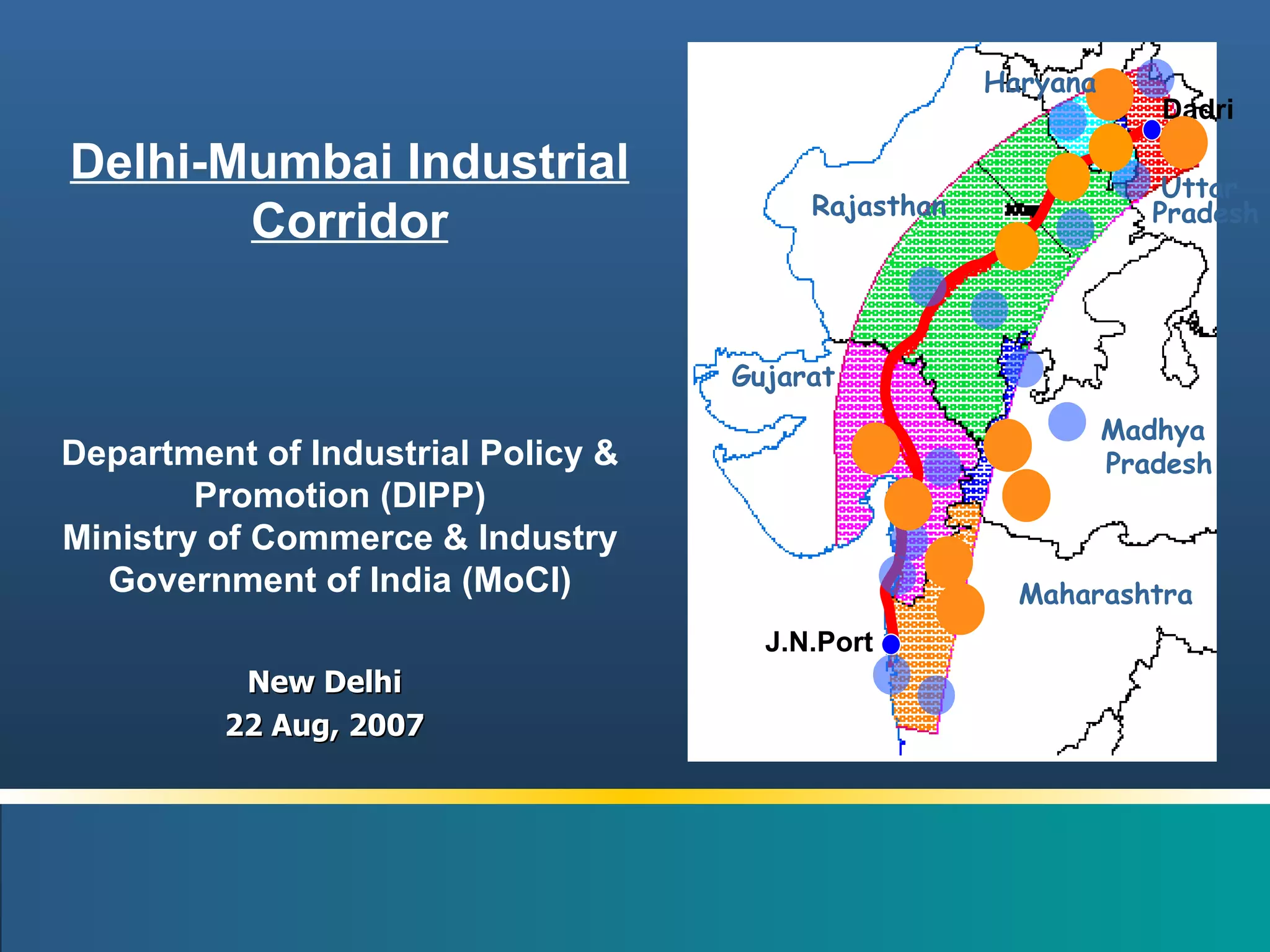 The document summarizes the Delhi-Mumbai Industrial Corridor project, a planned industrial development zone along a 1,483 km dedicated freight railway line between Delhi and Mumbai. Key points include that 24 investment regions and industrial areas have been identified for development in 6 states, with an estimated investment of $90 billion. A four-tier implementation structure is proposed, including an apex authority, corporate entity, program management consultant, and state-level coordination entities.