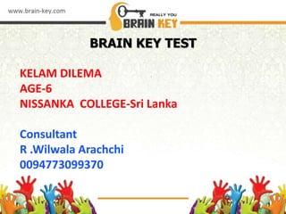 This document provides a brain key test analysis for an individual named Kelam Dilema, age 6, from Nissanka College in Sri Lanka. It includes analysis of the individual's brain lobes and functions, fingerprints, learning preferences, and recommendations. The temporal lobe was found to have the highest activation percentage at 23.81%, indicating strong abilities in language, memory, and emotion processing. Suggestions are provided to develop areas of improvement like management, leadership, logical thinking, and emotional control.
