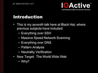 This document summarizes Dan Kaminsky's 2007 talk at Black Hat about exploiting vulnerabilities in the DNS system and web browser security policies to enable arbitrary TCP and UDP access from within a web browser. Kaminsky describes how controlling DNS responses allows an attacker to bypass firewalls and access internal networks by manipulating the browser's view of domain names and IP addresses. He then outlines his proof-of-concept attack software called "Slirpie" that implements a VPN-like tunnel using only a compromised web browser.