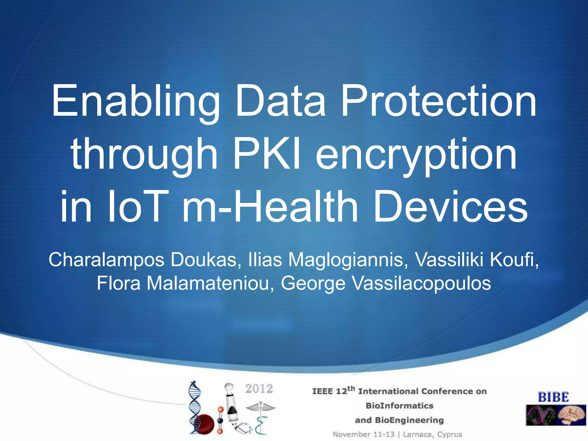 The document discusses a prototype cloud-based system that employs PKI encryption for data protection in IoT m-health devices, facilitating secure transmission and authentication of sensor data. It addresses challenges in healthcare related to security, interoperability, and data management, proposing IoT gateways to enhance computational resources and facilitate key management. Initial evaluations indicate that while the encryption process introduces some overhead, it remains acceptable for mobile health applications.