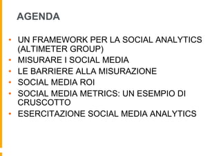 Il documento tratta l'importanza della misurazione delle performance nei social media, esplorando diverse metriche come ROI, ROE, ROP, e ROL, oltre a un framework per allineare le strategie aziendali. Viene sottolineata la necessità di superare diverse barriere per una misurazione efficace della social media analytics, come la mancanza di standard e la difficoltà di attribuire il valore alle metriche. Inoltre, propone un approccio integrato per la misurazione dei risultati dei social media attraverso un tracciamento adeguato e l'utilizzo di strumenti di analisi.