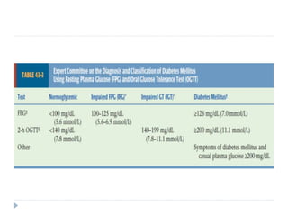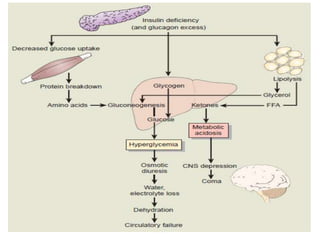3) It discusses the etiology, pathophysiology, clinical manifestations, diagnosis, and management of type 1 and type 2 DM.