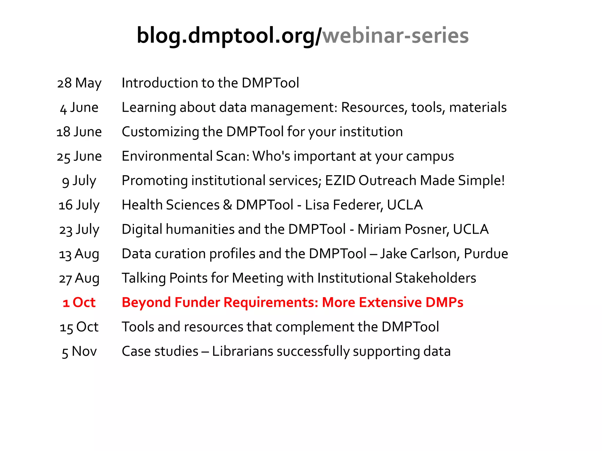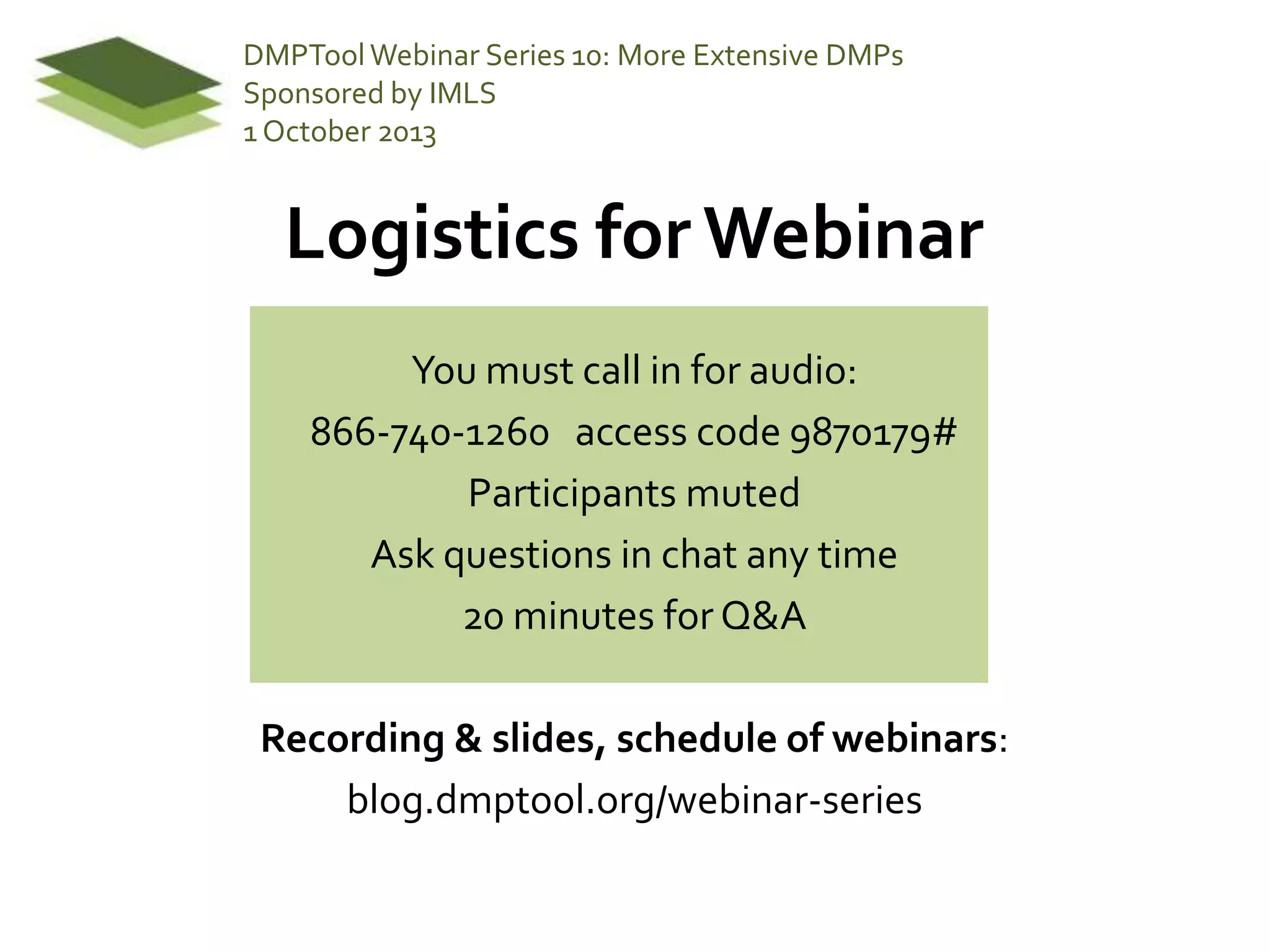 The document outlines logistics for a webinar series on data management planning, including audio dial-in information and a schedule of topics related to the DMPTool, data management plans, and institutional requirements. Goals of the webinars include reviewing funder requirements and operational data management. It also discusses data management best practices, responsibilities, and the importance of data archiving and sharing.