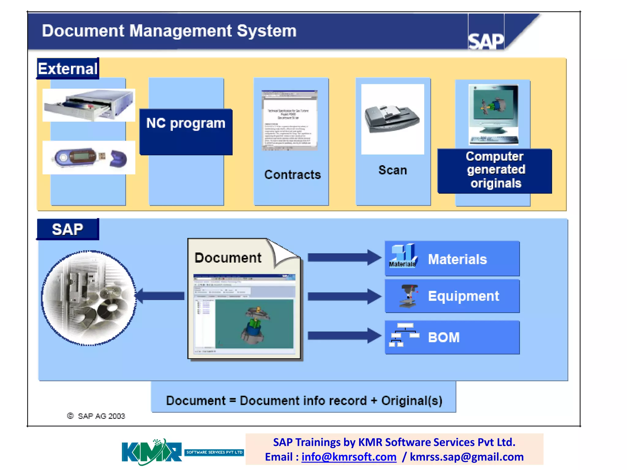 The document advertises SAP DMS functional training provided by KMR Software Services Pvt Ltd. It includes their contact information like website, email, phone number and Skype ID. The training is on SAP Document Management System and is conducted by KMR Software Services, who provide SAP trainings.
