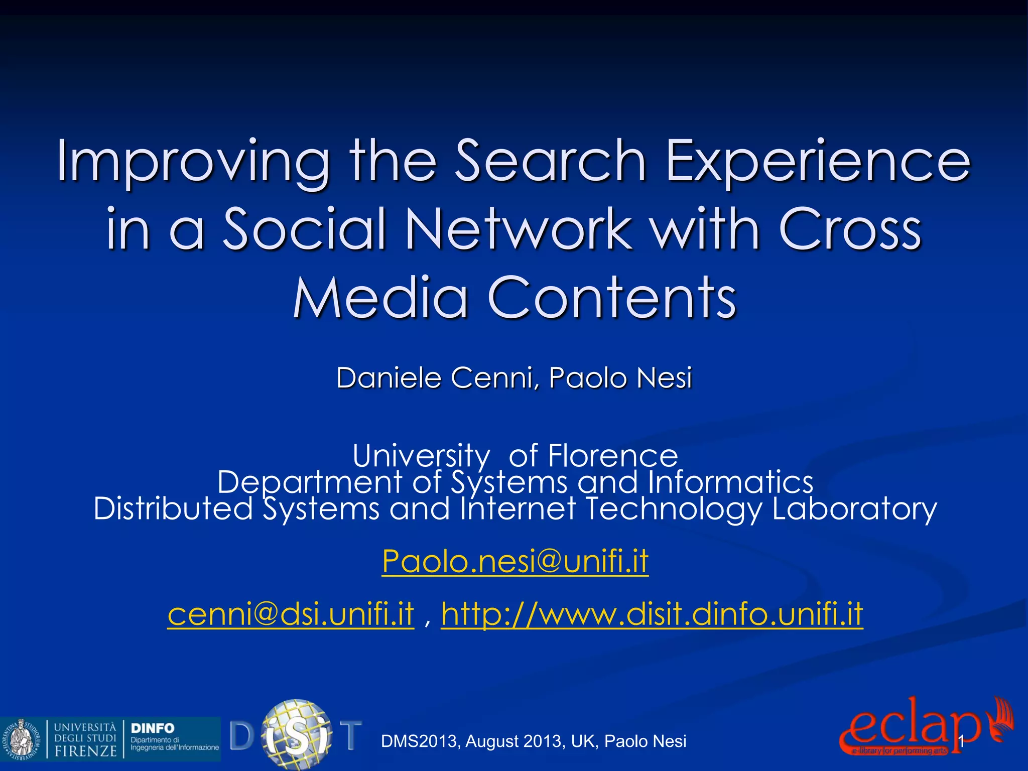 The document discusses an indexing and searching solution for the Eclap social network focused on the performing arts, leveraging multilingual and crossmedia content. It outlines the goals, technical requirements, and methodologies for improving search capabilities, including fuzzy search and faceted search, while assessing user engagement and satisfaction. Ultimately, it highlights improvements in search quality and user experience through advanced search techniques and algorithms.