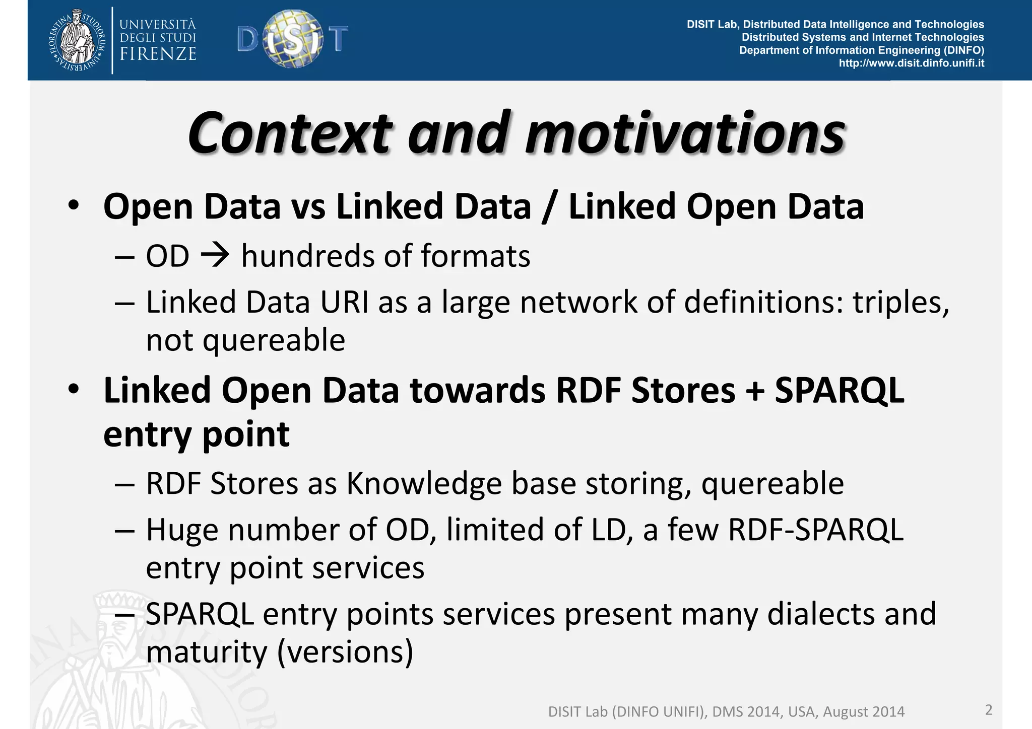 The document discusses the development of a distributed knowledge base (KB) leveraging Linked Open Data (LOD) and RDF technologies through SPARQL entry points. It outlines major features for accessing, querying, and manipulating linked data and emphasizes the integration and comparison of multiple data sources for enhanced understanding and exploration. The proposed model, log.disit, aims to support collaborative work, progressive browsing, and advanced querying capabilities in the domain of semantic web applications.