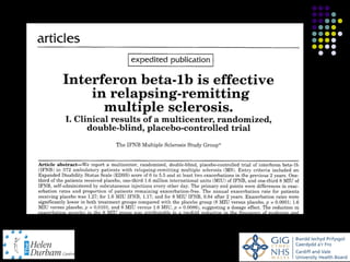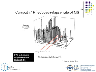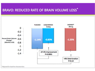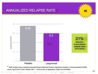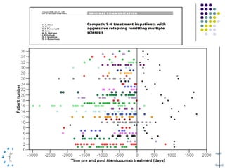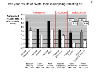 Disease modifying treatments for multiple sclerosis have evolved significantly over time. Early treatments focused on interferon-beta, which showed moderate effectiveness in reducing relapses and disability progression. Newer monoclonal antibody treatments such as natalizumab provided greater reductions in disease activity but also carried increased safety risks. The latest oral therapies including fingolimod, teriflunomide, dimethyl fumarate, and laquinimod provide over 50% reductions in relapse rates compared to earlier treatments with generally improved safety profiles. Ongoing research continues to evaluate new mechanisms of action to more effectively treat multiple sclerosis.