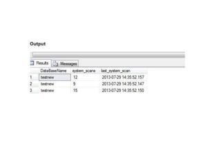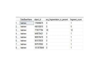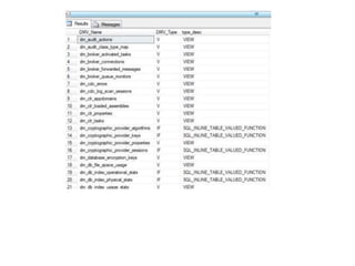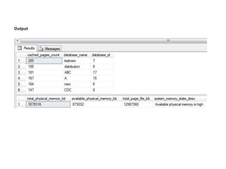 Dynamic management views and functions in SQL Server provide information to monitor server health, diagnose issues, and tune performance. There are server-scoped and database-scoped DMVs. Common DMV categories include database, execution, I/O, index, and operating system. The Performance Monitor tool in Windows collects counters related to physical disk, memory, CPU, and network usage to identify bottlenecks. High disk queue lengths, low available memory, or high processor utilization could indicate performance issues.
