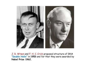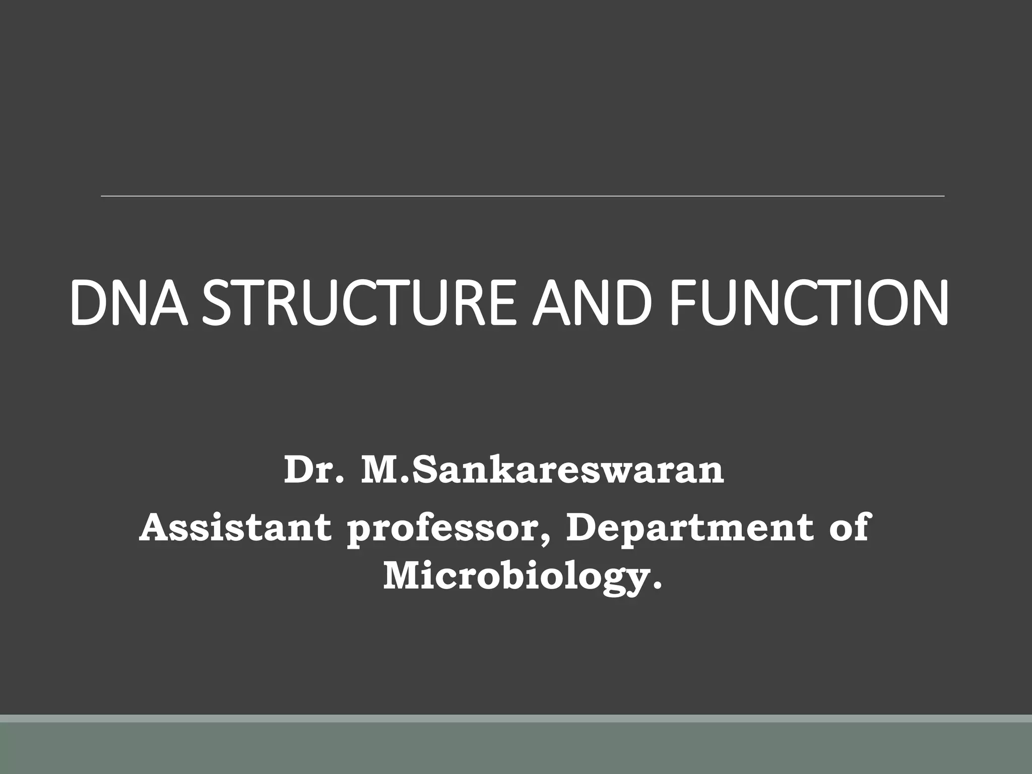 The document provides an overview of DNA structure and function, detailing its composition, discovery history, and key features such as the double helix and nucleotide formation. It explains the types of nitrogenous bases, bonding interactions, and the significance of antiparallel strand orientation and complementary base pairing. Additionally, it discusses the various forms of DNA, including A-DNA, B-DNA, and Z-DNA, and highlights DNA's roles in genetics, cell division, and biotechnology applications like DNA fingerprinting.
