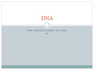 This document provides an overview of DNA and how genetic information is stored and expressed. It defines key terms like DNA, proteins, amino acids, replication, RNA, transcription, and translation. It explains that DNA contains genetic codes called alleles that store the instructions for life by telling cells what proteins to make, such as those that determine skin color or texture. It describes how DNA is a twisted ladder composed of nucleotide base pairs that replicate to make copies of the genetic material before cells divide.