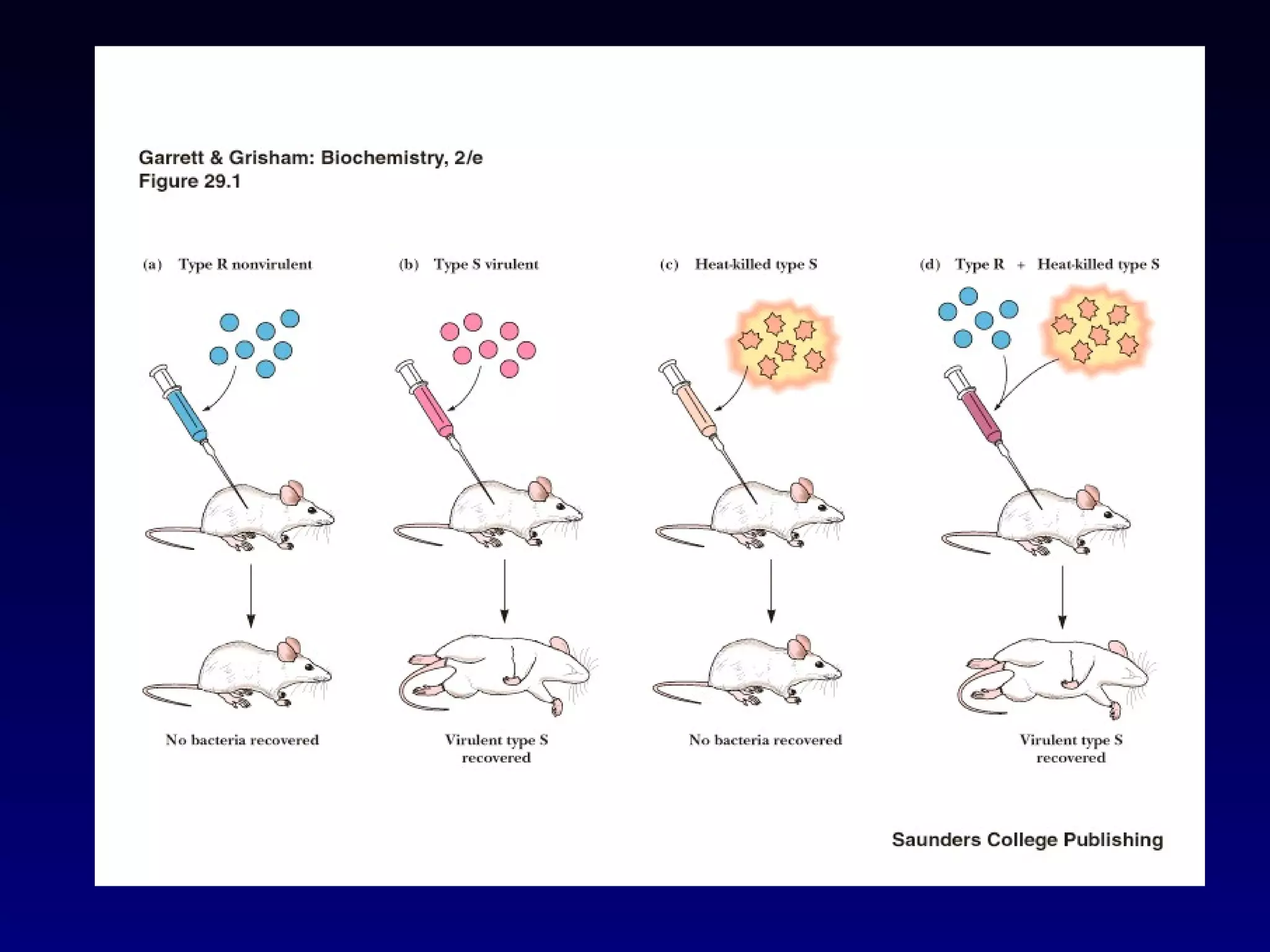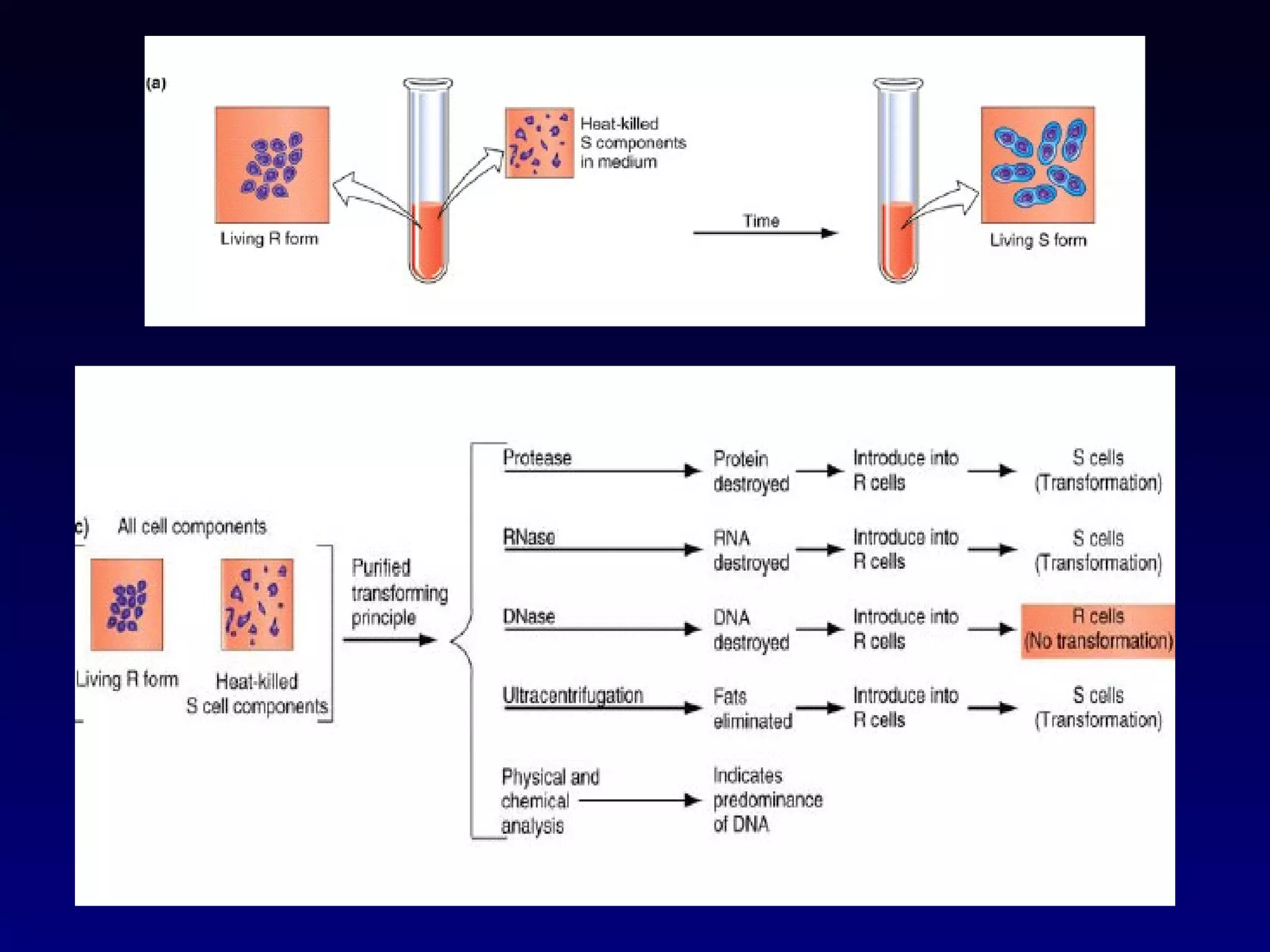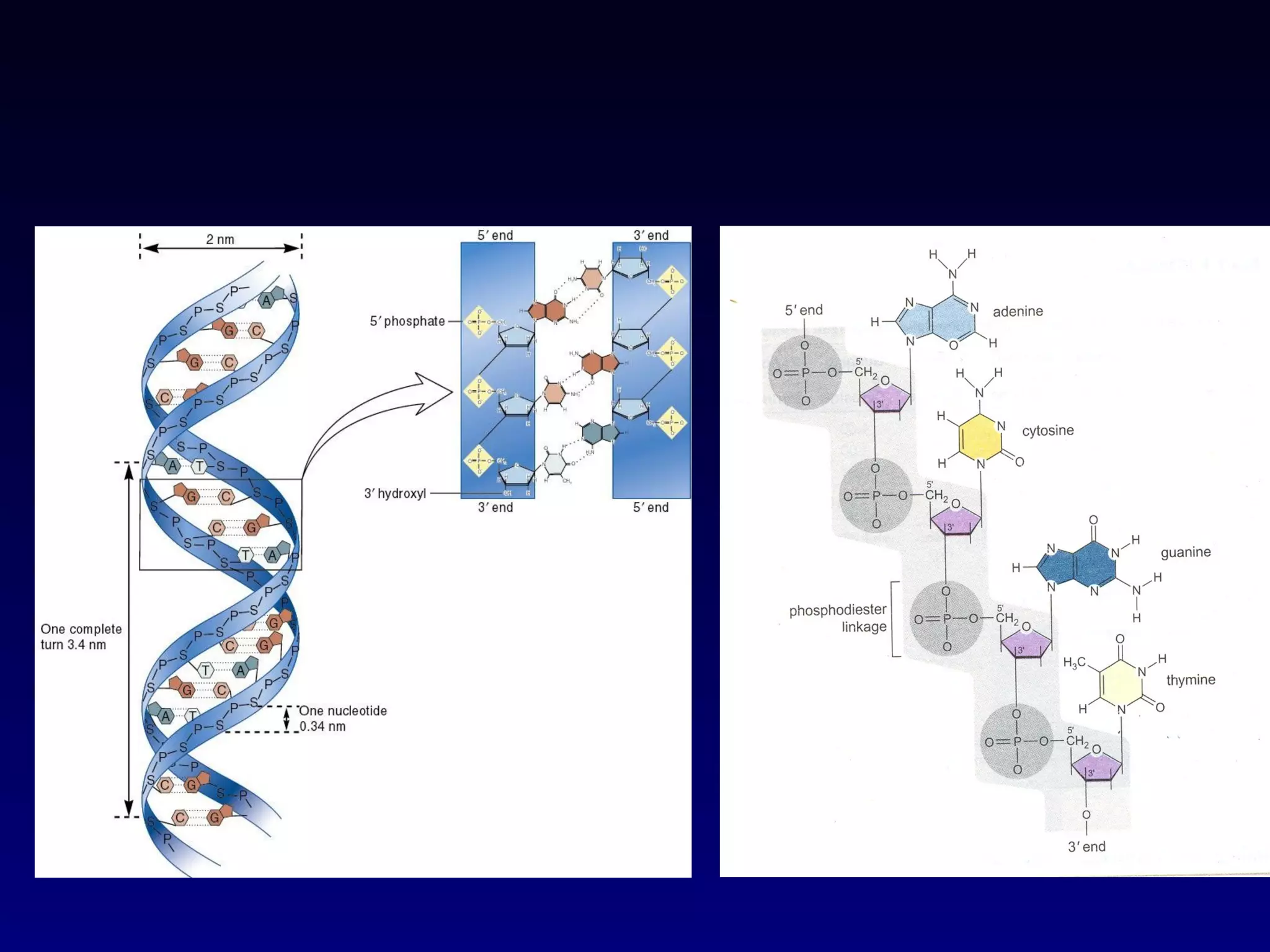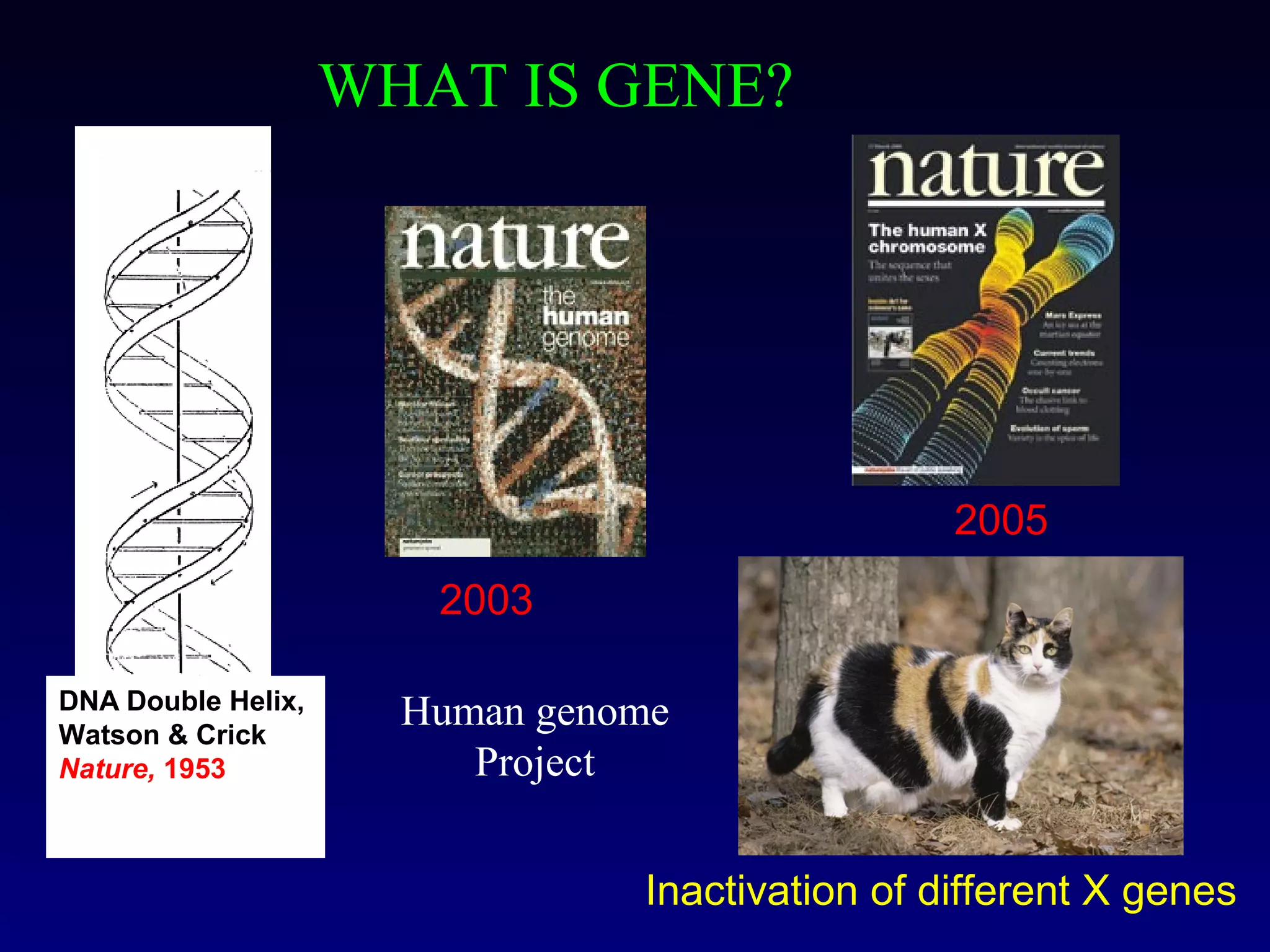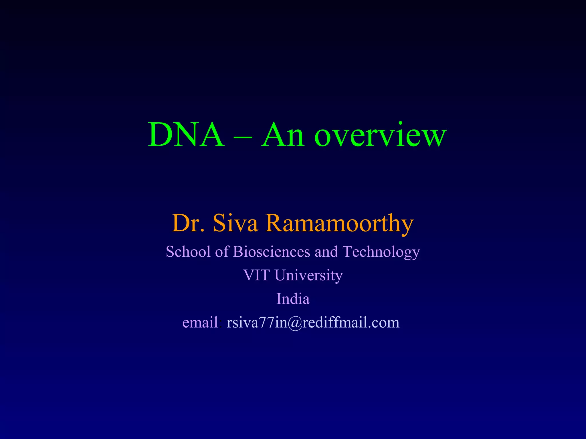 This document provides an overview of DNA and genetics. It discusses how DNA was established as the genetic material through experiments in the 1940s-1950s, including Griffith's transformation experiments, Avery et al.'s work demonstrating the transforming principle was DNA, and Hershey and Chase's experiments with bacterial viruses. It also summarizes the discovery of the DNA double helix structure by Watson and Crick in 1953, based on Chargaff's rules and X-ray crystallography data. The key properties of DNA structure, including specific base pairing and semiconservative replication, are briefly outlined.