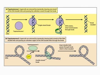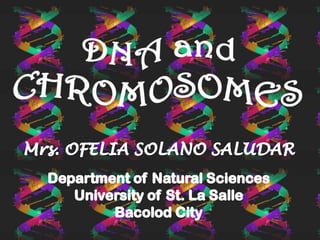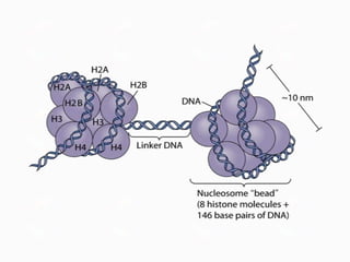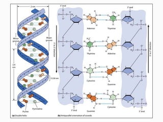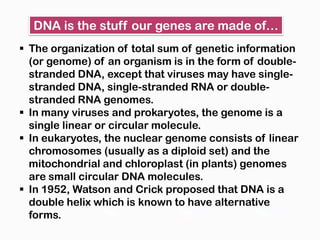 DNA is the genetic material found in the nucleus of eukaryotic cells and in the chromosomes of prokaryotes. It exists in several forms, including linear chromosomes in eukaryotes and circular chromosomes in prokaryotes and organelles. DNA is made up of a double helix structure stabilized by hydrogen bonding between complementary nucleotide base pairs. The structure of DNA allows it to efficiently store and transmit genetic information.