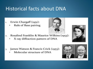The document discusses the structure and significance of DNA, detailing its historical context and composition as a biopolymer made of nucleotides. It highlights the Watson-Crick model of DNA, explaining its double helix structure, base pairing rules, and various forms of DNA like A-DNA and Z-DNA. Additionally, it describes the stabilizing forces that maintain DNA's integrity, including hydrogen bonding, base stacking, ionic interactions, and hydrophobic forces.
