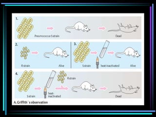 1. Frederick Griffith's experiments in 1928 with pneumococcus bacteria showed that genetic information could be transferred between bacteria.