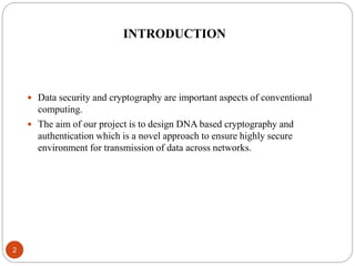 This document describes a proposed DNA-based cryptography and authentication system. The system aims to provide secure data transmission across networks using a novel DNA-based approach. It involves encrypting plaintext messages into DNA sequences using symmetric or asymmetric encryption algorithms. The encrypted DNA sequences can then be transmitted and decrypted back to the original plaintext. The proposed system implements a double layer of encryption using both RSA and DNA-based cryptography for enhanced security. It is intended to securely transmit messages, emails, and files across both local and wide area networks.