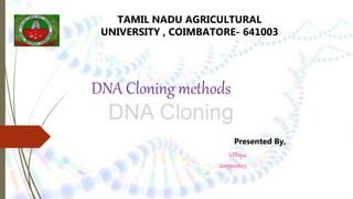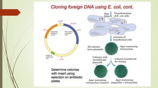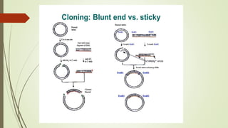 DNA cloning techniques allow for the reproduction of DNA fragments. There are two main approaches: cell-based cloning using living cells and in vitro cloning using PCR. The cloning process involves cutting out the gene of interest and a host plasmid with the same restriction enzyme, ligating the gene into the plasmid, transforming bacteria with the new plasmid, and selecting for transformed colonies. Common cloning vectors include plasmids, bacteriophages, cosmids, YACs, and retroviral vectors which allow incorporation of foreign DNA into host genomes. PCR cloning strategies like TA cloning take advantage of Taq polymerase adding extra adenines to PCR products, allowing ligation into vectors with thymidine overhangs.