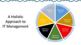 ETS offers a holistic approach to IT management called DNACloud that includes server, desktop, security, network management, mobility, backup, and mail solutions. DNACloud provides monitoring, asset management, antivirus, patching, and updates for clients' networks without long term contracts. The server solution offers powerful and secure cloud environments with storage and failover protection. Virtual desktops are delivered online, offline and in the cloud with Windows, Linux, and thin clients. Email uses Microsoft Exchange for competitive pricing with security, archiving, and information protection features. Backup securely encrypts data from various systems and platforms and is monitored for consistency. Mobility keeps users connected on demand for first responders, education, and mobile business professionals.