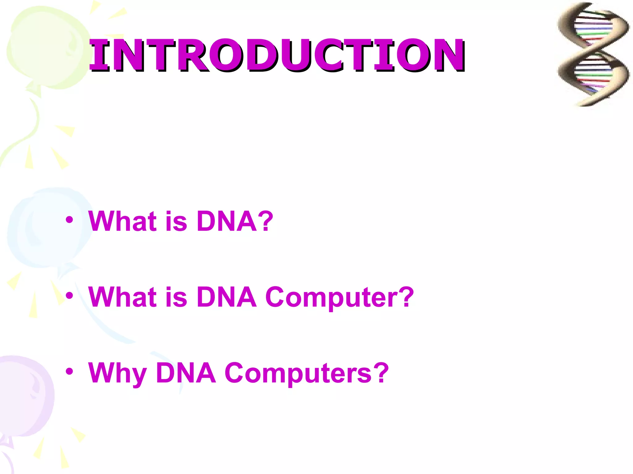 DNA computing is a novel approach that uses DNA, genetic material, and biochemical processes to solve computational problems. DNA computers have significant potential advantages over traditional silicon-based computers, including massive parallelism, large storage capacity, and low energy usage. However, DNA computing also faces challenges such as slow operation speeds and reliability issues that need to be addressed through ongoing research.