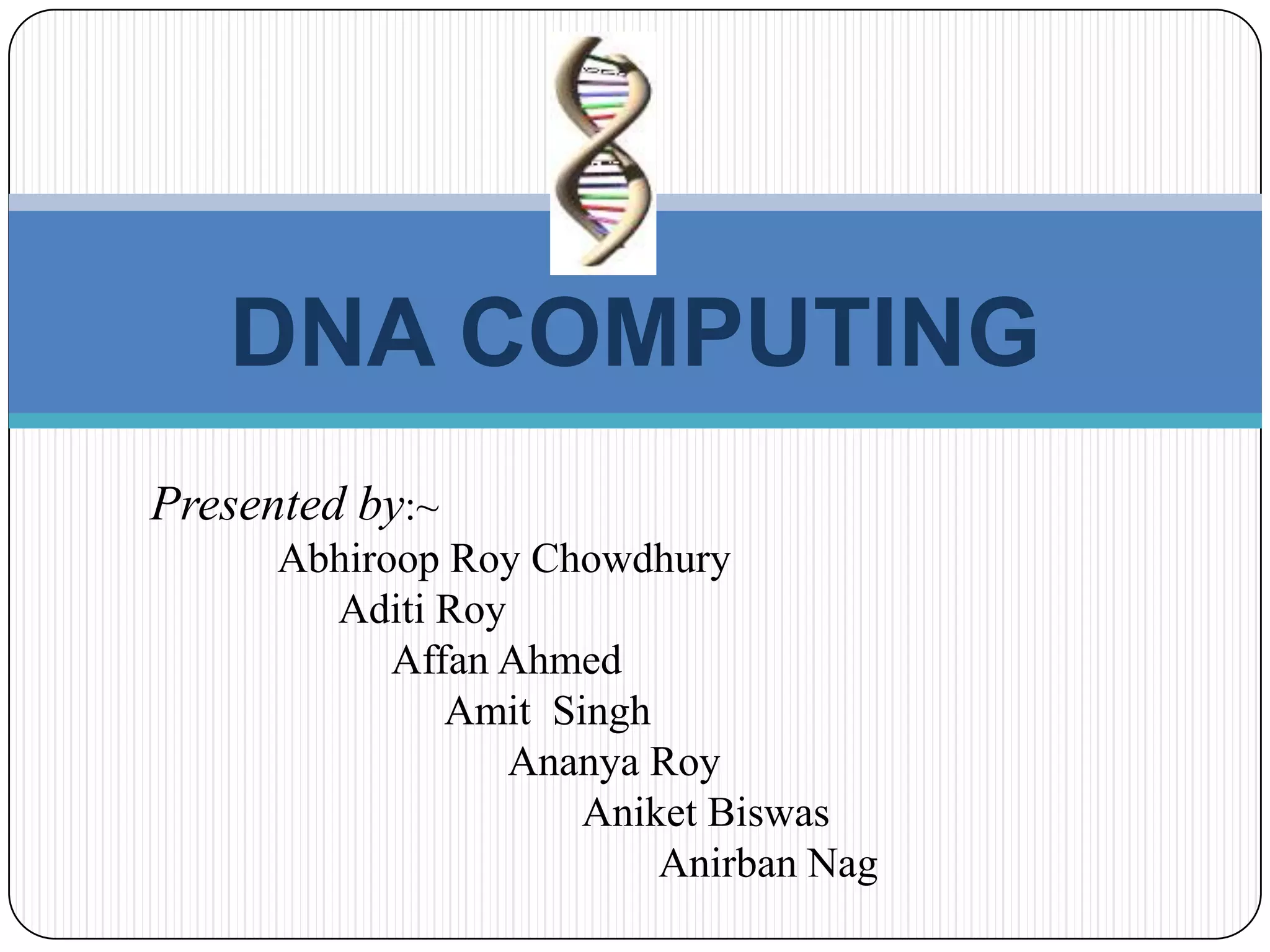 This document summarizes a presentation on DNA computing. It begins with an introduction to DNA and DNA computing, explaining how biological techniques can be used for efficient computing. It then discusses logical operations in DNA computers and Adleman's solution to the Hamiltonian path problem. The document compares DNA chips to silicon chips and outlines some advantages and applications of DNA computing, as well as its limitations and future prospects. It concludes by discussing potential applications like cryptography and planning efficient routes.