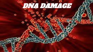 DNA contains our genetic material and can be damaged through various means. DNA damage is an alteration in the structure of DNA, such as breaks in strands or changes to nucleotide bases. Living things are constantly exposed to factors that can damage DNA, both endogenously through natural processes in the body and exogenously through external environmental sources like radiation. While repair systems work to fix most DNA damage, unrepaired damage accumulates and has been linked to various health conditions and diseases.