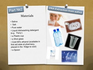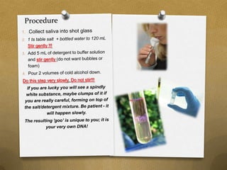 This document provides instructions for extracting DNA from saliva at home. It explains that DNA can be found inside cells in the nucleus and is packaged into chromosomes. The procedure involves swishing mouthwash to collect cheek cells, spitting into a solution of water and detergent to lyse the cells and release DNA, then adding cold alcohol which causes the DNA to separate out and form white strands or clumps visible at the top of the mixture. With patience, one can isolate their own unique DNA through this simple at-home extraction process.