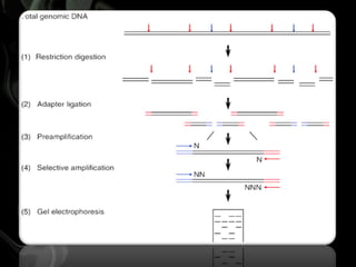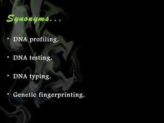 DNA fingerprinting is a technique developed in 1984 that analyzes variable regions in genetic material to distinguish one person from another. It involves isolating DNA from a sample, cutting it with restriction enzymes, sorting by size, and probing specific locations to generate a unique pattern. This technique uses variations in the number of short tandem repeats between individuals and has been used successfully in criminal cases and establishing paternity. The most common DNA fingerprinting methods are electrophoresis, polymerase chain reaction, restriction fragment length polymorphism, random amplified polymorphic DNA, and amplified fragment length polymorphism. DNA fingerprinting has applications in diagnosing inherited disorders, developing cures, and identifying criminals using biological evidence.
