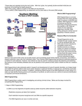 DNA fingerprinting is a process for identifying individuals based on their unique DNA patterns. It involves isolating DNA from a sample, cutting the DNA into fragments using restriction enzymes, sorting the fragments by size through gel electrophoresis, transferring the fragments to a membrane, and using radioactive probes to detect matching fragments and produce a fingerprint pattern for identification purposes. DNA fingerprinting is widely used in forensic investigations and criminal cases to identify suspects, as well as in diagnosing genetic disorders and researching cures due to its ability to distinguish individuals based on their DNA sequences.