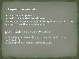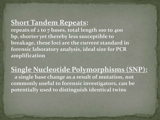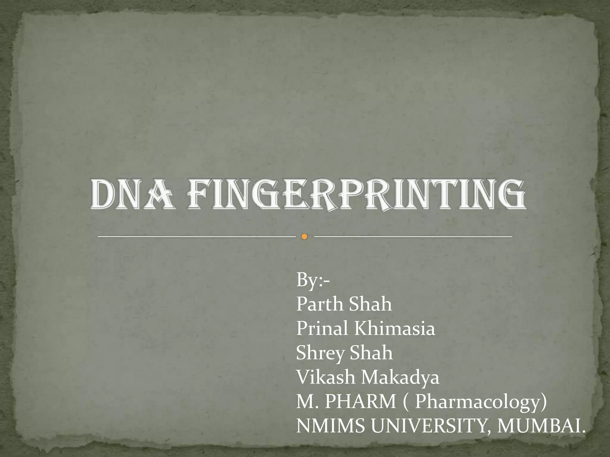DNA fingerprinting is a method used to identify individuals based on variations in their DNA sequences. It involves using restriction enzymes to cut DNA into fragments at specific sequences, which are then separated by size using gel electrophoresis. The pattern of fragment sizes is unique to each individual and can be used to identify a person, determine paternity, solve criminal cases, diagnose genetic disorders, and develop cures. The document provides details on the different types of tandem repeats like satellites, minisatellites, and microsatellites that contribute to variations between individuals, as well as the basic process and applications of DNA fingerprinting.