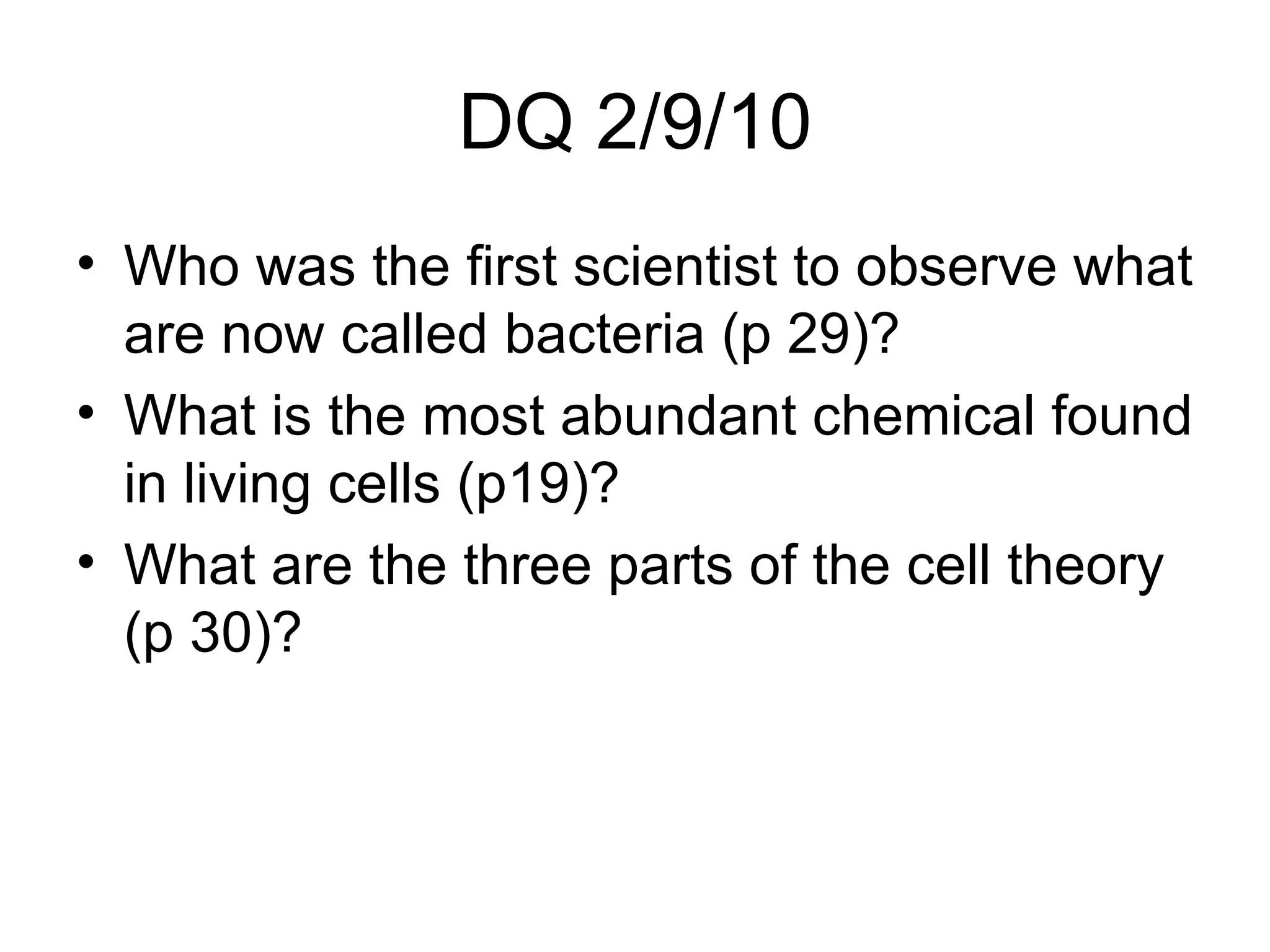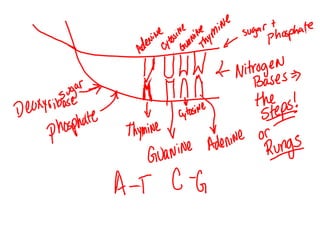 The document contains questions about early scientists who observed bacteria and the most abundant chemical in living cells, as well as the three parts of the cell theory. It also discusses DNA replication, including that DNA makes a copy of itself before mitosis, DNA replication ensures each new cell has the genetic information it needs, and in 1953 Watson and Crick figured out the structure of DNA and how it copies itself. DNA looks like a twisted ladder or double helix with sugars and nitrogen bases making up the sides.