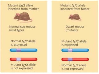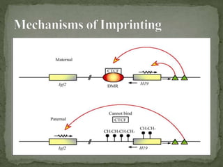 DNA imprinting is an epigenetic mechanism where the paternal and maternal genomes have functional differences due to heritable changes in gene expression and activity without altering the DNA sequence. Imprinting requires DNA methylation and histone modifications that silence genes during egg and sperm formation. Disturbances in imprinting can result in abnormal embryonic development and syndromes like Prader-Willi and Angelman, which occur when an imprinted gene's mutated allele is inherited from only one parent.