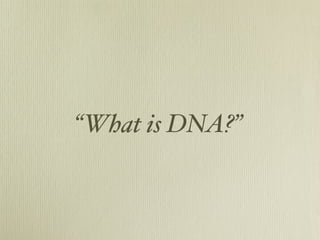 This document discusses what was known about DNA in the early 1950s and the discovery of its structure. It was known that DNA contained phosphorus, deoxyribose sugar, and the nitrogen bases adenine, guanine, thymine and cytosine. Researchers like Wilkins, Franklin, Watson, and Crick were studying DNA and proposed the double helix structure based on Franklin's X-ray diffraction images, with complementary base pairing of A-T and C-G. This double helix model explained DNA's structure and how it replicates.